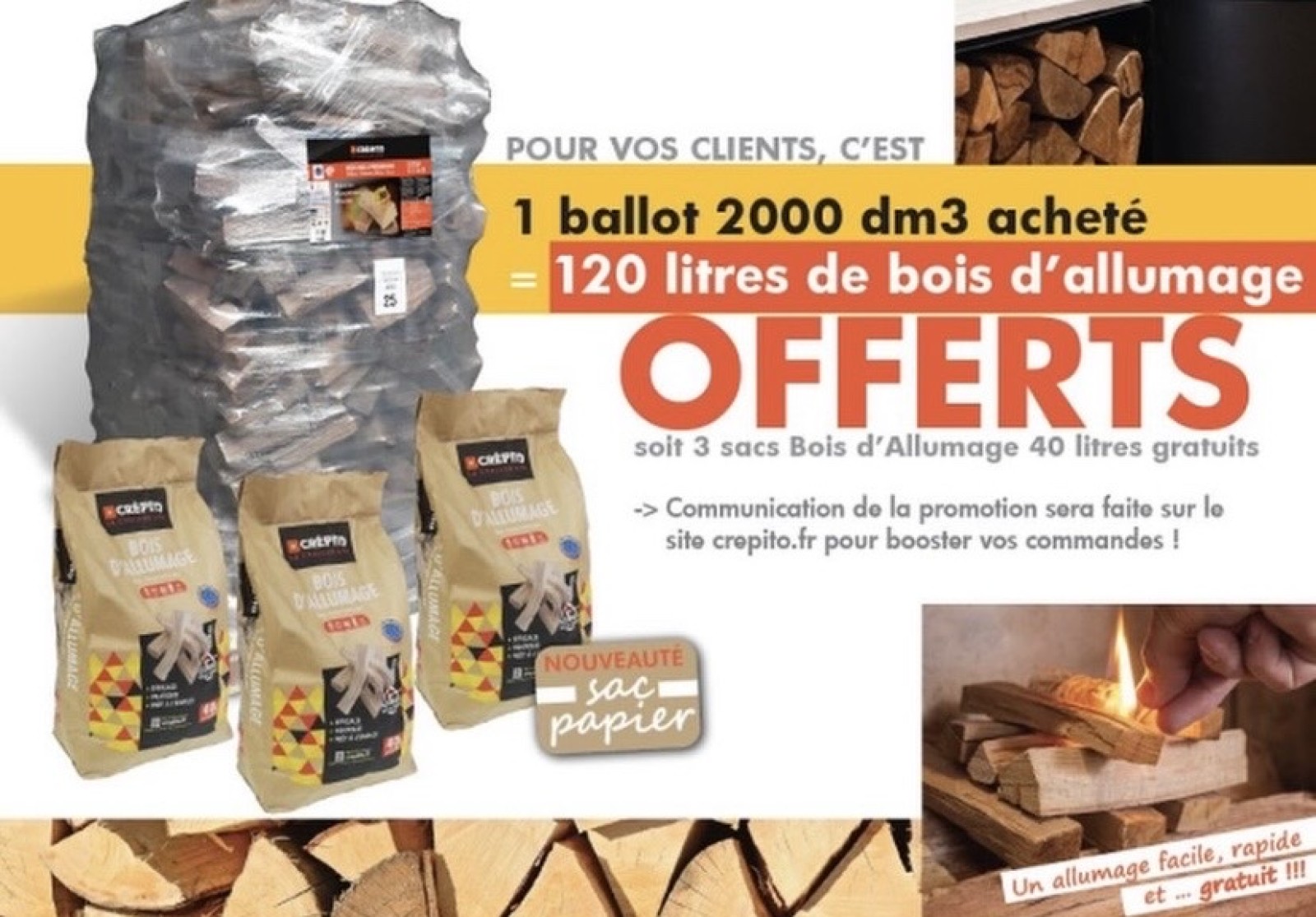 Pour l’achat d’une palette de bois Premium H1G1, 3 sacs d’allumage de 40L offert idéal pour allumer vos feux de cheminée cette hiver mais également vos barbecues cette été.
